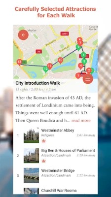 Εξερευνήστε πόλεις με αυτο-οδηγούμενες περιηγήσεις στα κυριότερα αξιοθέατα. Η εφαρμογή προσφέρει λεπτομερείς χάρτες διαδρομών και ισχυρή πλοήγηση. Απολαύστε την πόλη με τον δικό σας ρυθμό, αποφεύγοντας ακριβές οργανωμένες εκδρομές, εξοικονομώντας χρόνο και χρήμα.