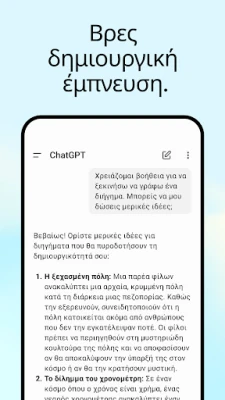 Αποκτήστε πρόσβαση στην τεχνητή νοημοσύνη του ChatGPT με την επίσημη εφαρμογή. Λάβετε άμεσες απαντήσεις, δημιουργικές ιδέες και εξατομικευμένη υποστήριξη για κάθε σας ερώτηση. Ο έξυπνος βοηθός σας, πάντα διαθέσιμος, παντού.